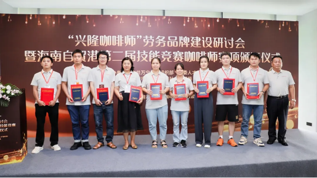 研讨会结束后,与会领导还为获奖选手颁发了赛项高级工等级证书、赛项技师技能等级证书。据了解,在2023年海南自贸港咖啡文化节期间,省人力资源和社会保障厅联合万宁市政府组织了第二届海南自贸港职业技能竞赛咖啡师赛项。来自全省各地近200名选手参赛,经激烈角逐,产生金、银、铜奖3名和优胜奖21名。按大赛规程规定,19名优胜奖选手获得高级工技能等级资格,5名选手获得咖啡师技师技能等级资格,3名选手获得了“海南省技术能手”称号。竞赛活动不仅为咖啡从业者提供了一个技能交流的平台,也提升了兴隆咖啡文化品牌的影响力、推动咖啡产业高质量发展。同年11月,“兴隆咖啡师”作为琼派咖啡师劳务品牌的代表,参加了海南省劳务品牌推介活动。