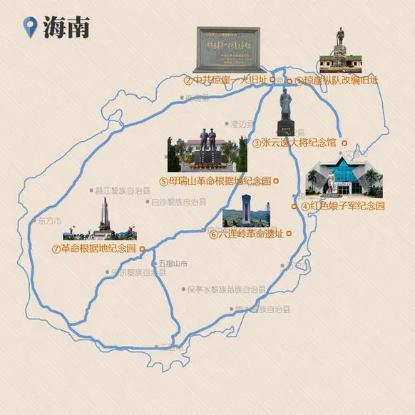 其中, 红色娘子军纪念园先后被列为全国爱国主义教育基地、海南省爱国主义教育基地、全国红色旅游经典景区;琼崖红军云龙改编旧址被列为全国首批100家爱国主义教育基地、海南省文物保护单位、海南省青少年革命传统教育基地;六连岭革命根据地先后荣获全国爱国主义教育示范基地、全国红色旅游经典景区、国家级抗战遗址等荣誉称号;母瑞山革命根据地纪念园是海南省青少年革命历史教育基地……