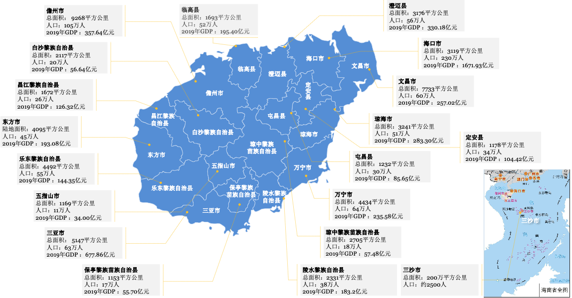 海南省辖4个地级市,5个县级市、4个县、6个自治县,是中国唯一的热带岛屿省 份,因改革开放而生、因改革开放而兴,是中国最大的经济特区、最大的自由贸易试验区和首个中国特色自由贸易港。