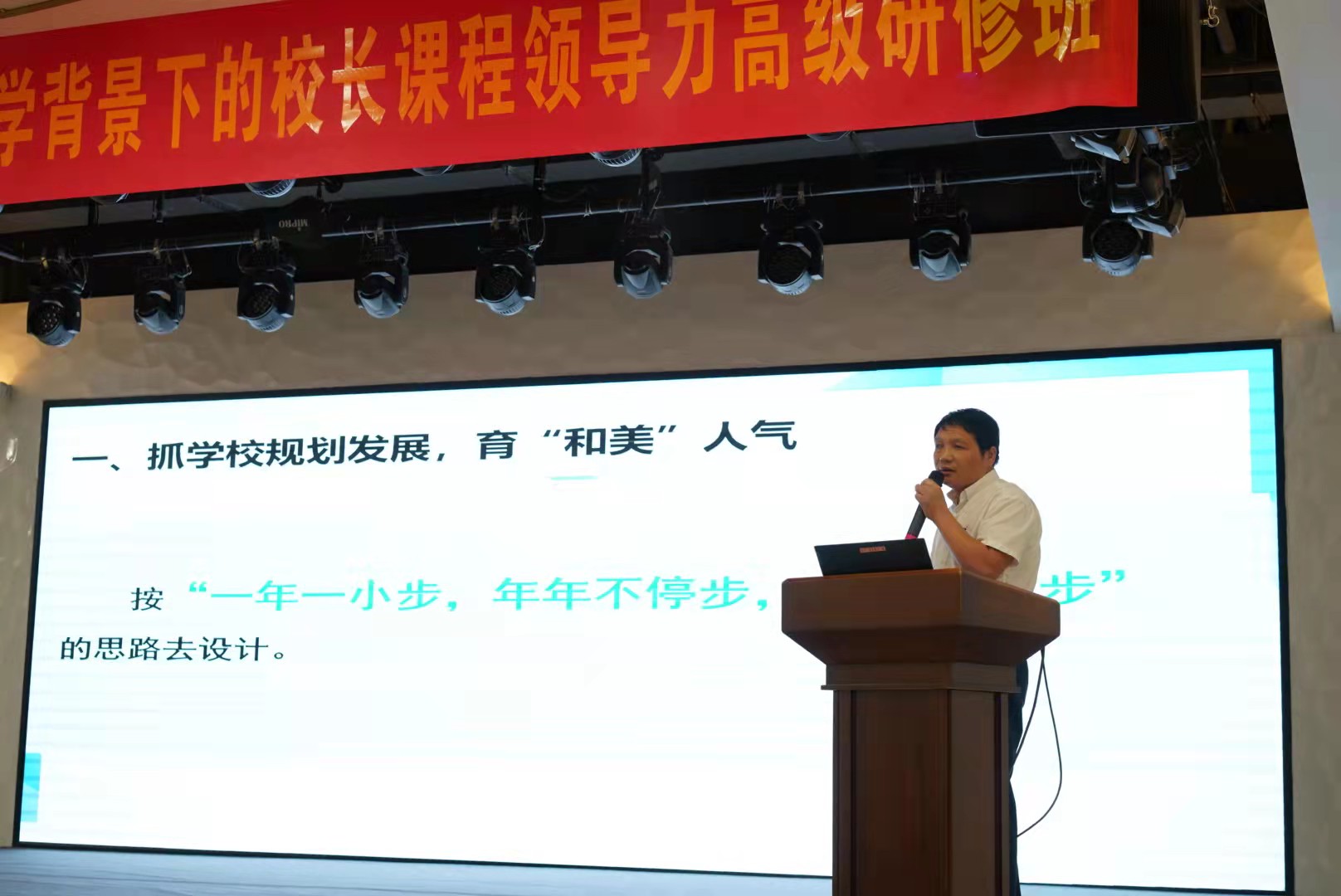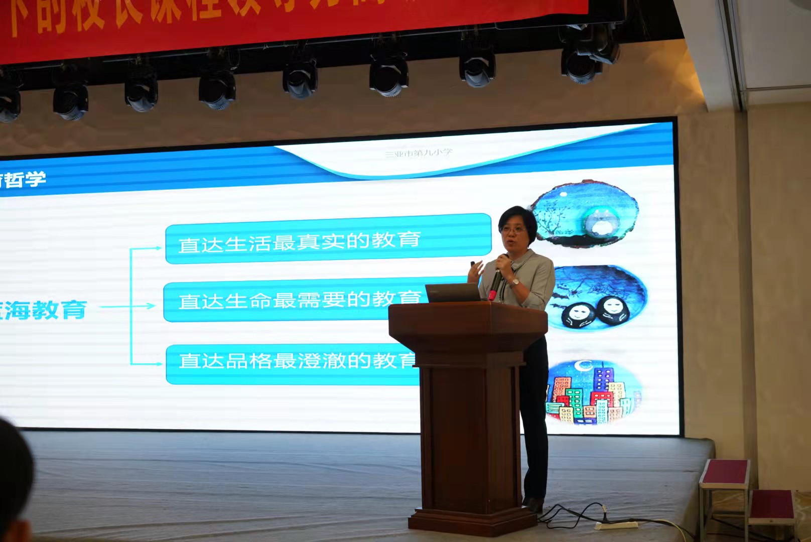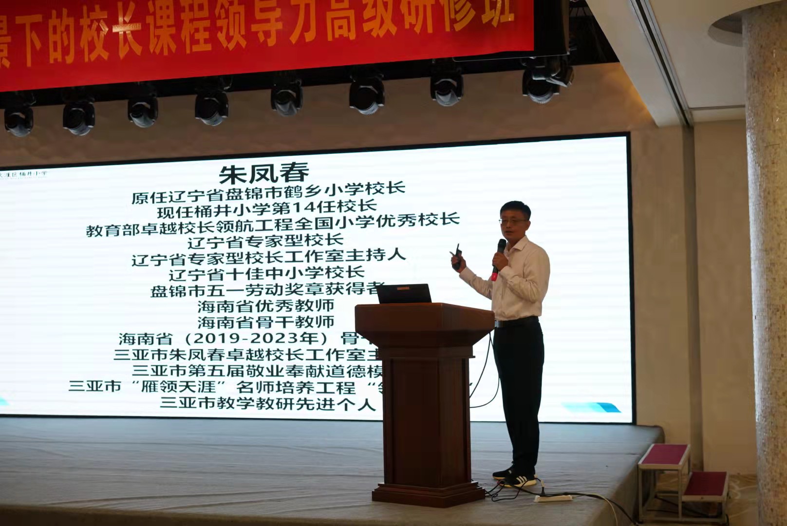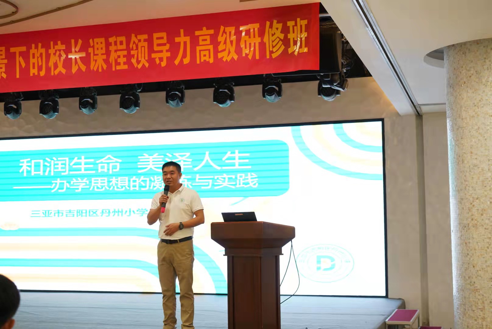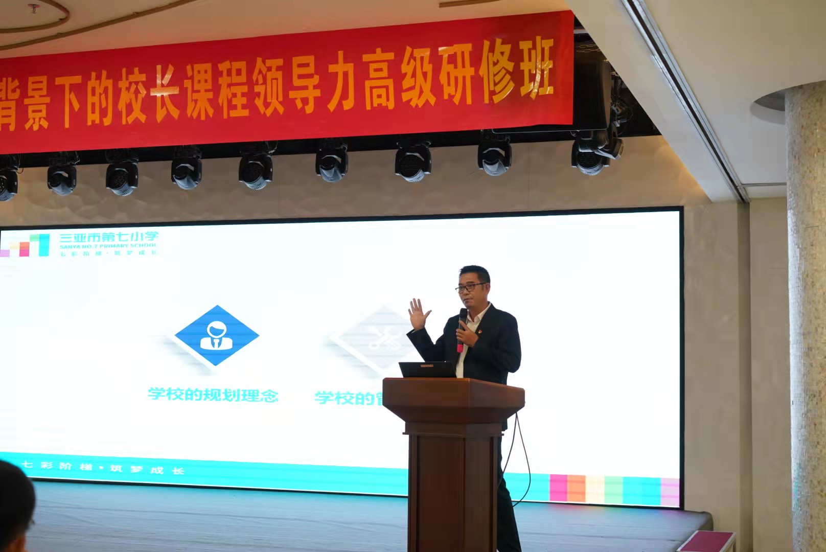 此次校长办学思想分享会由赵日升校长主持,三亚市教培院院长吕锐、副主任闫学忠、“银发精英”丁勇慧校长和120位校长学员参加。